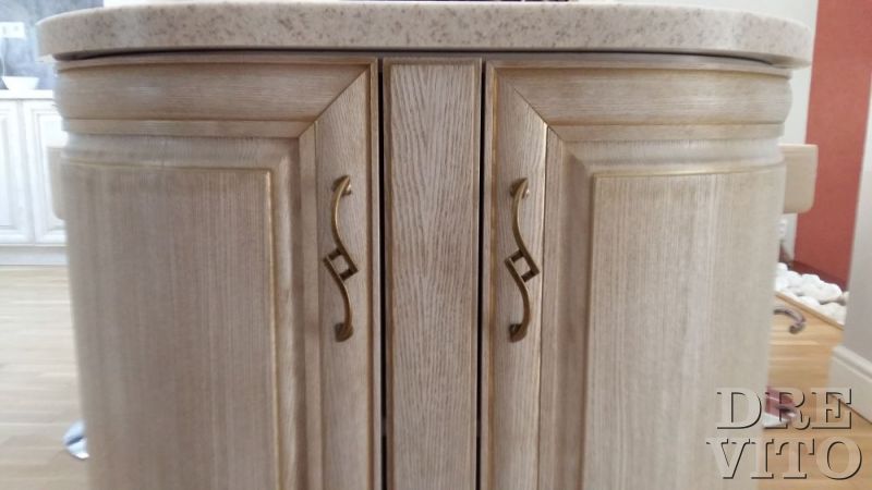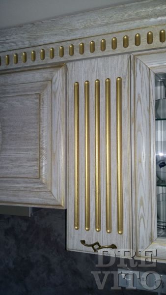 Na tejto kuchynskej linke som použil masívny jaseň, ktorý bol opracovaný kefovou brúskou, následne natieraný kvalitnou bielou farbou a finálne vytieraný zlatou patinou. Výber umelého kameňa na pracovnú dosku som volil hlavne pre teplejší pocit z dotyku (oproti chladnejšiemu mramoru) a dobrému opracovaniu na žiadaný rozmer a tvar. Tak čo poviete, páči sa vám? :)